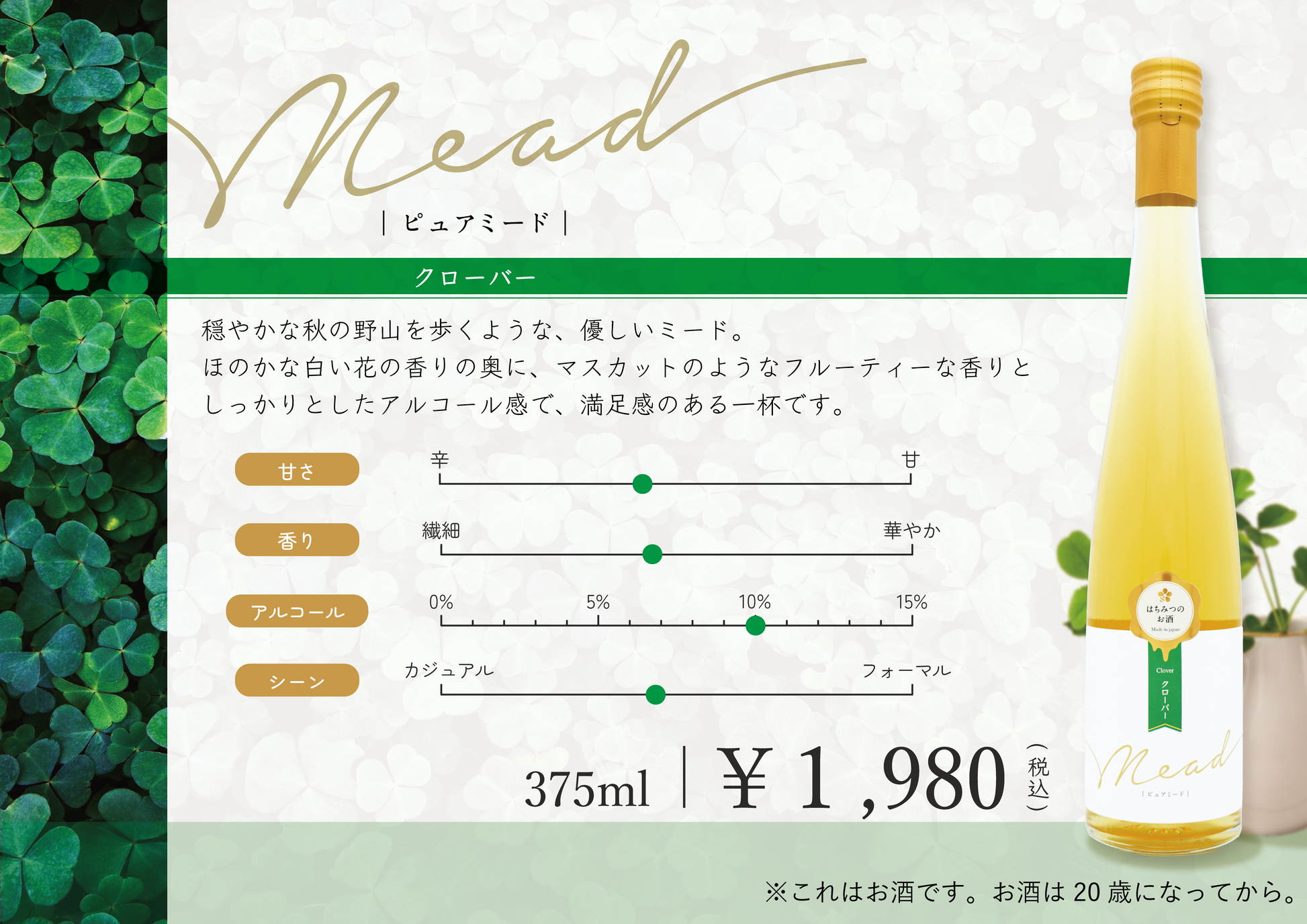 今回は珍しいクローバーの蜂蜜を贅沢に使用した秋の夜長にぴったりのお酒です。
