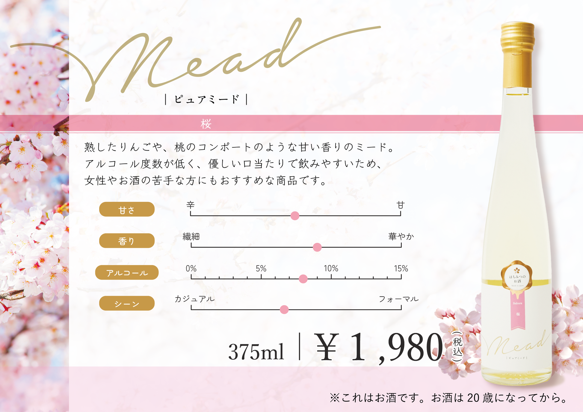 はちみつ工房のミードは、はちみつと水、酵母のみで醸造します。フルーツやハーブをブレンドする他社や海外のミードと違い、はちみつ本来の甘味や風味に加え、花の種類によって異なる香りを大切に、丁寧に醸造しています。